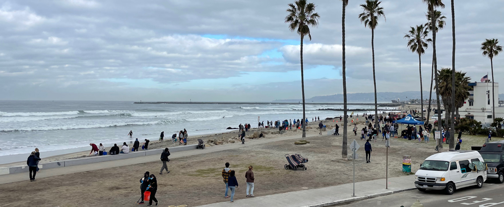 I did not go out to the beach itself, but from the hotel balcony I had a great bird's eye view of the somewhat surreal scene. The steely-gray water was clogged with surfers despite the overcast and 50F morning. It made me realize what a lot of effort is involved for the ride—like skiers being obliged to walk up the slope they wish to slide down. The beach and the small park separating it from the road were even more crowded. In addition to the usual joggers, strollers, joggers-with-strollers, dog walkers, and beach posers, a rock band played a 30 minute long Santana- / Duane Allman-like guitar solo at a respectful volume. In front of them a small troupe of slack-liners had stretched their rope between two palm trees and practiced getting up on the rope unaided which meant getting on your feet from a one-footed squat position. I'd never unpacked the noun tightrope before, but now I know what the opposite is called—and this rope was definately slack—it made perfect sense. The rod-like stability of the tightrope looked easy to walk in comparison to the swing-like mobility of the slack line. And how many of us can rise to a standing position from a one-footed squat even without simultaneously balancing on a swaying rope? I was mesmorized, which is how come I know how long the guitar solo lasted.