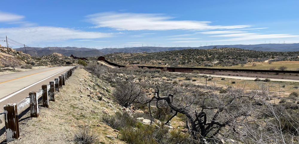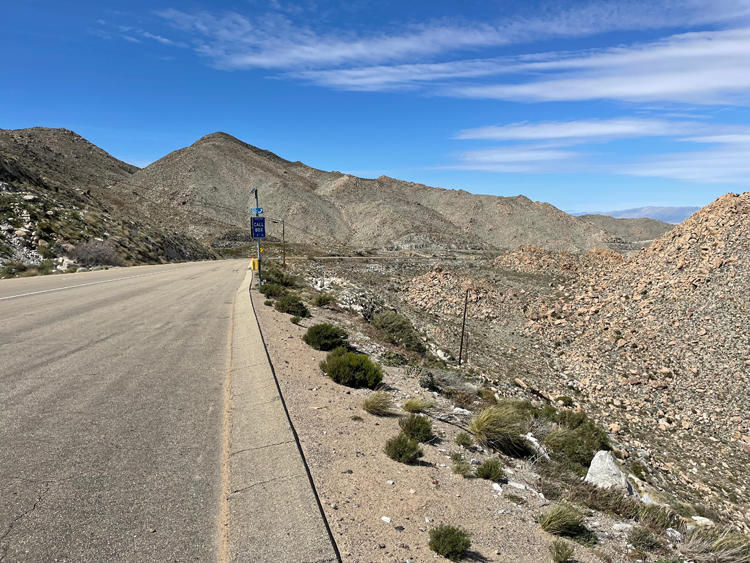 Departure was delayed to let the temperature rise a little, but presumably this was a one-off I was thinking. Hahaha! Little did I know. At least this time we could put on all the cold weather gear. It's a crazy day today. Another 2900ft of climbing, then 6700ft of descent. Massachusetts at the top: 34f; hills; snow. Southern California at the bottom: 71f; pancake; desert. The route travels through the Yuha Desert and the below-sea-level, irrigated Imperial Valley. Bill gained a point back by setting off 30 minutes before the rest of the party but we'd still caught up with him at the first rest stop. He goes like the clappers down hill—he must have been doing an easy 45 miles per hour when he shot past us—but uphill, of which there were three or four in the first part of the ride, he is barely moving. We rolled though what felt like a border patrol check point, but all the way up here? The uniforms were stopping all the cars coming the other way but paid no attention to us. We were soon to discover how close we were to the border, so yes! Border Patrol! |