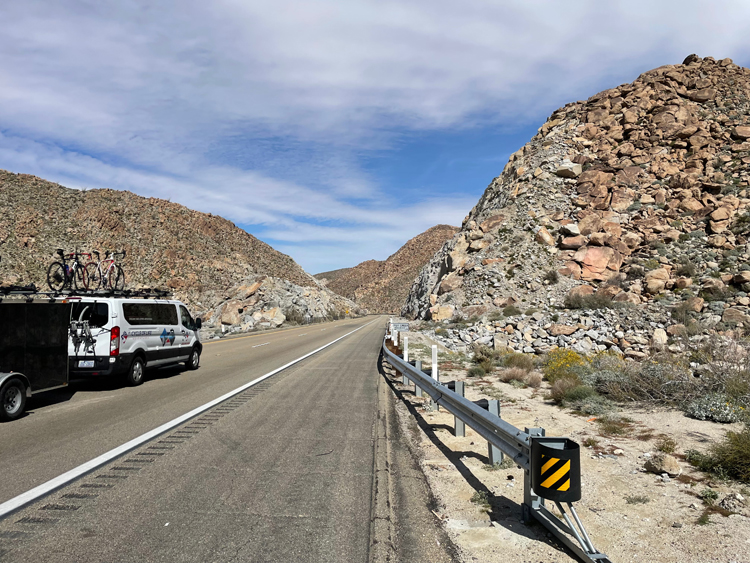 While Tim nursed his shoulder in the van, the rest of us bashed on for the second half of the ride, across the Yuha desert. Totally fabulous. We came within a few hundred yards of the Border Wall I thought we didn't build, and would see for days on and off. We crossed the Juan Bautista de Anza National Historic Trail, (a 1,200-mile trail "connecting history, culture, and outdoor recreation from Nogales, Arizona, to the San Francisco Bay Area") but there was nowhere to grab a stamp for my book, even if I'd had it. The last 10 miles home were brain-addlingly rough, and everyone had had enough by the time we finally pulled in. It put my Garmin into a coma, and several folks had apps that thought they'd been in a bad enough fall that it triggered a call to their emergency contacts. |