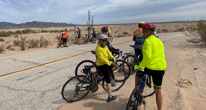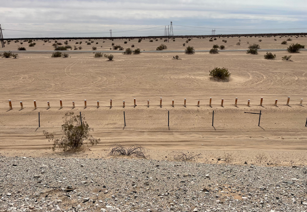 The slow group kept up with the big dogs all morning. It was such good and easy going on the flat, and with whatever wind there was on our tails. Since Bill set off 30 minutes before the rest, we all pulled in to the first water stop pretty much together. A trifecta for Dennis who loves us to stick together as much as possible. There was 40 miles of smoooth road before hitting the highway once more. A "Drifting Sand" road sign explained a gang digging out a culvert running beside the road. Two miles from Yuma we picked up the wall again. A Border Patrol chopper cruised slowly along it at about 50ft. Their trucks were parked up along the road and a little distance into the desert at a very regular cadence.
