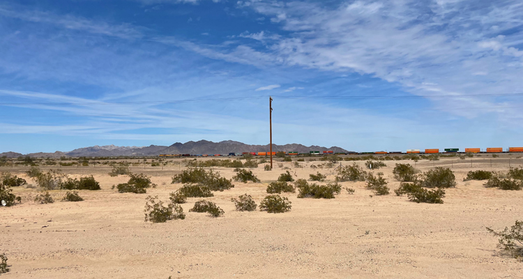 We continued to roll east following the highway and the rail road, and for the first time, sequoias. Mile-long trains pass at a regular interval. They typically have three locomotives at the front, and one had two more in the middle. I'm told that the number of locomotives and the length of the train is all calculated by the weight. So empty trains are longer than full ones. Generally they comprise an endless variety of wagons, but one was only military vehicles. It was stopped, and the reason was plain to see. The back half had broken free of the front half, and sat a forlorn-looking 20 feet behind. I hope that was not an endictment of the military—"they couldn't create a train from a bunch of wagons and a locomotive".