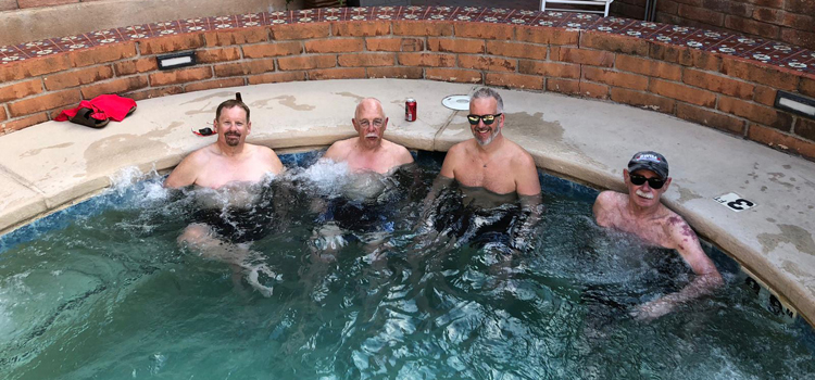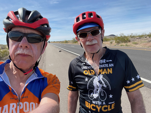 The few other riders we meet are mostly also going cross-country. A solo contender we passed heading west was a conspicuously different bronze color. Another self-supported couple showed up in the hotel that night, and Dennis invited them to join us at our pizza and beer celebration of crossing into Arizona. We peppered them with questions. Bill (who else?) asked "What sort of rack do you have?" "Jeez, I don't even know your name yet" was her instant response, and it took a second for the crew to catch up but catch up they did. Raucous laughter all around.