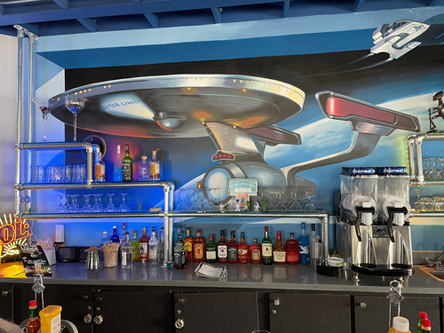 A sign heading into Gila Bend announced the "Pipe Organ National Monument", so for a brief moment I dreamed of another stamp in my book. But the next sign in the center of town pointed left saying "Pipe Organ NM 75 miles". Oh well. Moments later we rolled into the Gila Bend Space Age Restaurant and Best Western Hotel and rolled back about 50 years. The space age theme ran through the hotel but it was really focused on the bar. What the term "space age" means seems to depend on the era you grew up in. To some of us it is American pride, Saturn V, Neil Armstrong, the moon. To others it is Star Trek and Star Wars and aliens. The Space Age bar was firmly in the latter camp complete with life-size alien for selfie ops (yes aliens turn out to be just the right size for selfies). |