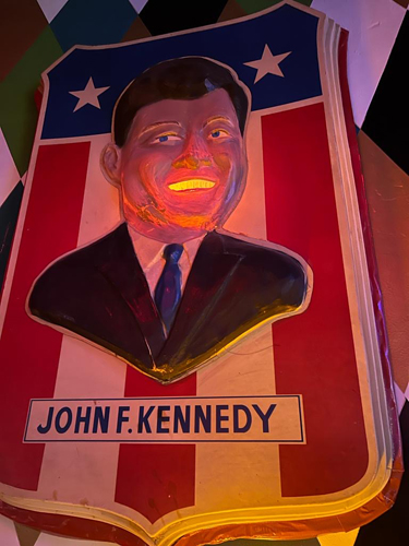 ![]() The Shelter is a bomb shelter-themed bar that has barely changed since it opened in 1961. "The name, exterior, and decor are all nods to the Cold War." As in, the whole place was designed to look like a fallout shelter. Like a 'real' fallout shelter, the exterior is windowless and clad in white stucco and stone, albeit topped with imposing neon signage. Inside, the walls are covered in old mirrors, patterned wallpaper, velvet paintings, period advertisements, and kitschy JFK memorabilia, including hand-crafted tapestries in his image. The U-shaped bar is surrounded with comfy red stools, and a Sputnik-inspired lamp orbiting just above the bar."