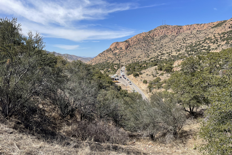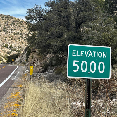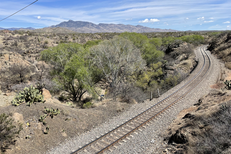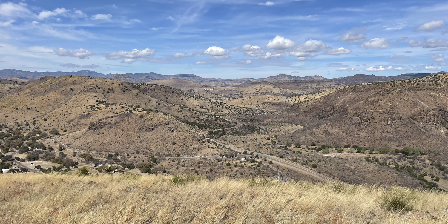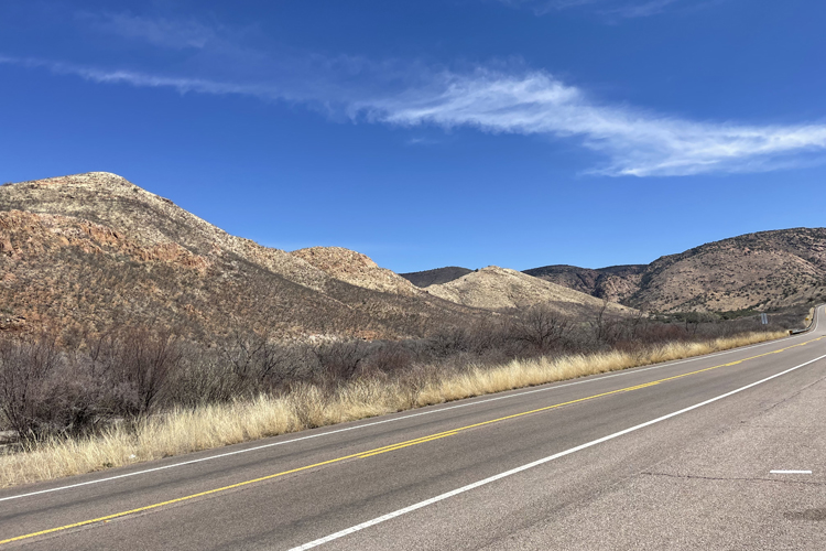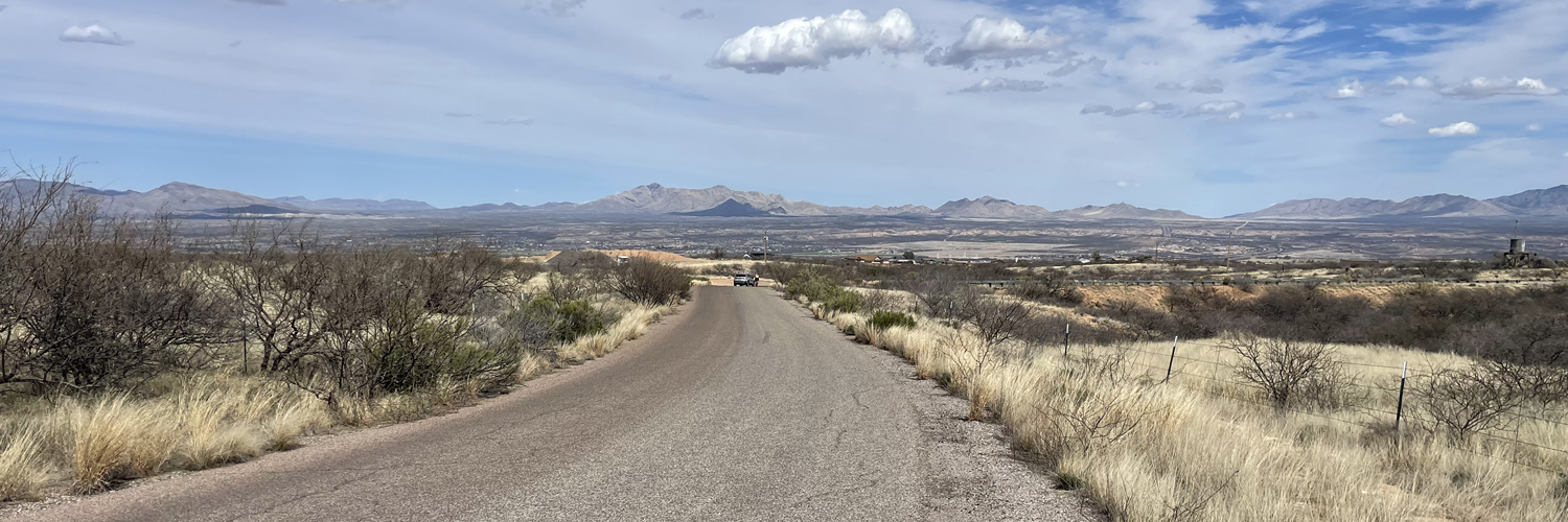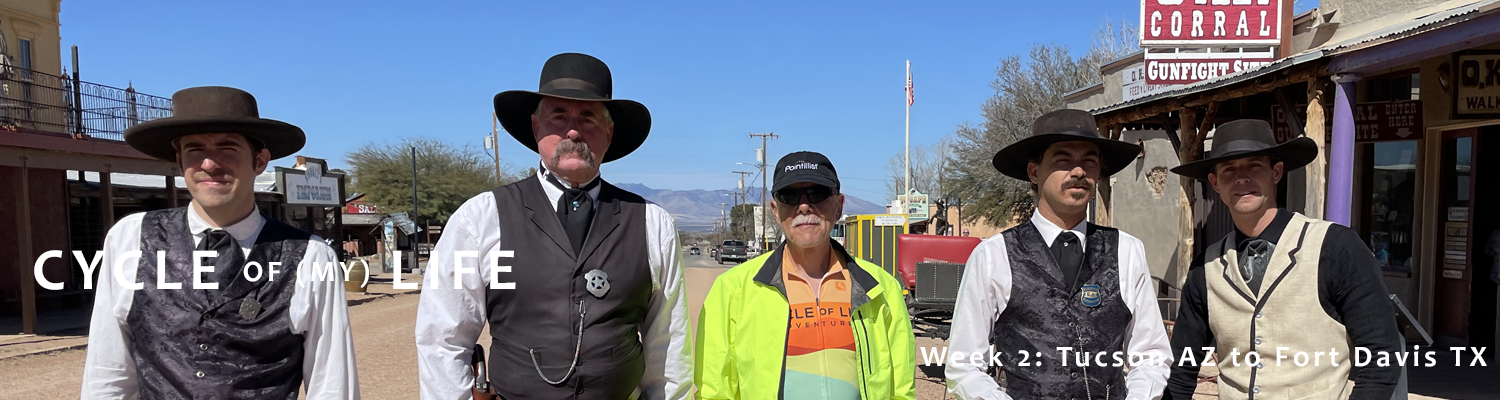 The sixth straight day of sleeping higher than waking up. It is hard to believe that Saguaro was only yesterday, and this may partially explain why last week feels like a completely different adventure: it is such a distant memory it is hard to believe we are on the same trip. Benson to Bisbee makes almost no progress eastwards instead heading towards the border, hence another Border Patrol check point for northbound traffic. It is the second day of hockey stick elevation: long long gentle incline and at the end a short sharp climb followed by a descent into town. But the climb was a doozy: 6 miles and 1400 ft up to 6045ft, (depending on who's counting) the highest elevation on the whole trip. The day was deliberately short to allow as much time as we wanted in Tombstone, and because there was a big climb after that.