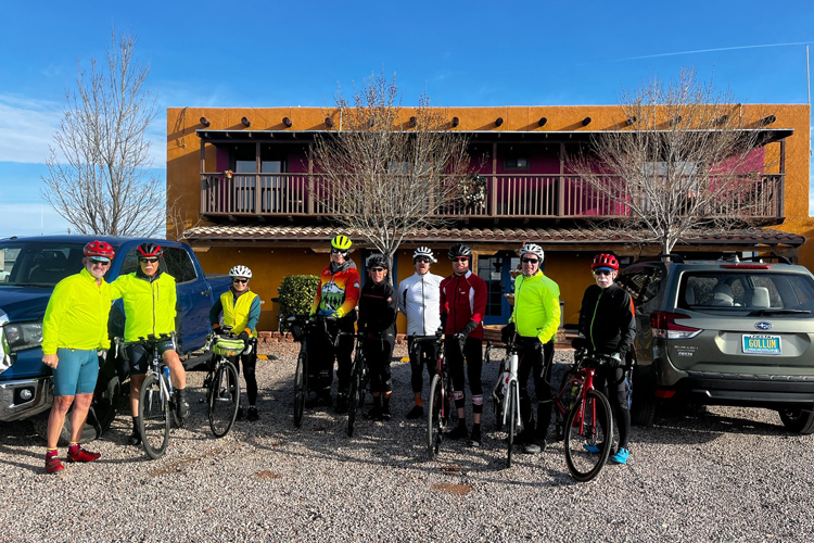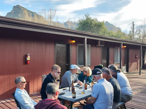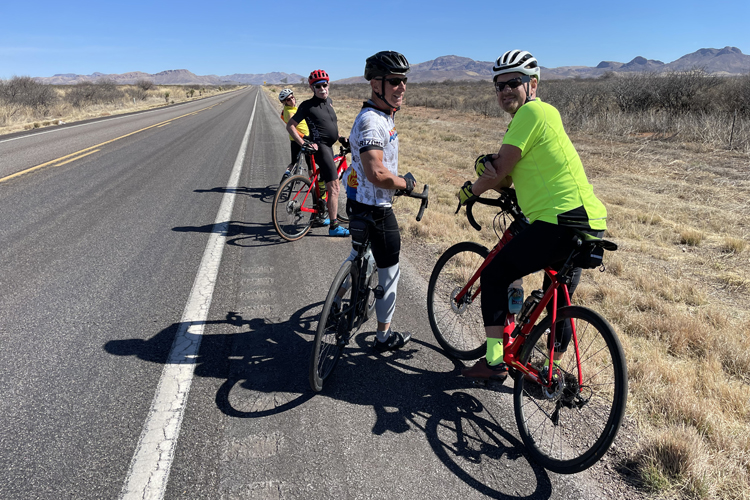 The most noteworthy attraction other than the outstanding beauty of the desert, was passing the stone pillar commemorating Geronimo's surrender to General Nelson Miles on September 6 1886. Then 10 miles later we hit the New Mexico state line, and at breakneck speeds, I averaged 22 mph over this last segment ending at the New Mexico state line. The big dogs did me the honor of letting me "pull" the team the whole way, eventually crossing the line first. I'm joking of course. Pulling is what happens in a pace line, and the big dogs were way too savvy to ride that close to me. But they let me stay out front anyway. Having crossed into New Mexico, we promptly crossed back into Arizona to spend our last Arizona night at Portal. The remaining 10 miles were not so pretty. The only time we turn westward, and everyone seemed to be dragging as if the backwards direction was applying additional resistance. The 500ft of "unnecessary" climbing definitely was. So the last five or so miles back to the motel seemed to take forever. As we neared Portal, I started to hear birds for what felt like the first time, and shortly thereafter lo, a B&B for Birders. Finally we were there. The place had an army barrack sort of feel to it: two typical motel one-storey, strip-mall rows, but here facing each other across a 15ft boardwalk. A couple of picnic tables in the middle of the boardwalk made a splendid Happy Hour gathering spot. It is frustrating that when we got to somewhere on Sunday, the bike shop or restaurant we wanted would be shut on Sundays. But when we get there on Monday, Mondays, are their day off. Now incredibly here we were on a Tuesday, and Tuesday is the day off for the only restaurant in this truly one-horse town, (it was actually attached to the motel). So kudos once more to Dennis, they opened specially for us (and another crew to be fair, so this was probably the busiest day of their week and definitely worth opening for. The Southwestern salad with chicken (lots of sweet corn and red peppers stirred up with chopped up grilled chicken) was delicious. The cherry cobbler had a more manufactured taste to it but was a welcome treat. Also nice that the iced tea was homemade and unsweetened. |