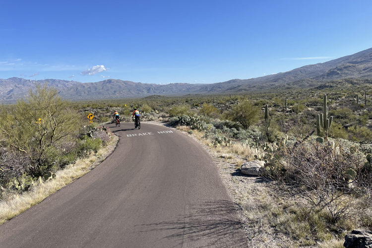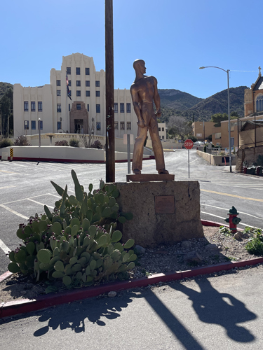 Then back on the bikes, but not before Dave-the-Younger was able snag a local root beer from the shack that had finally opened. Watching the show meant that the two Daves and I were last away for the 6 mile 1400 ft grind to the top of the hill. I was pleasantly surprised that I did not need to stop, and that I was able to more or less keep up with the two Daves. We re-grouped at the top before screaming down into Bisbee.