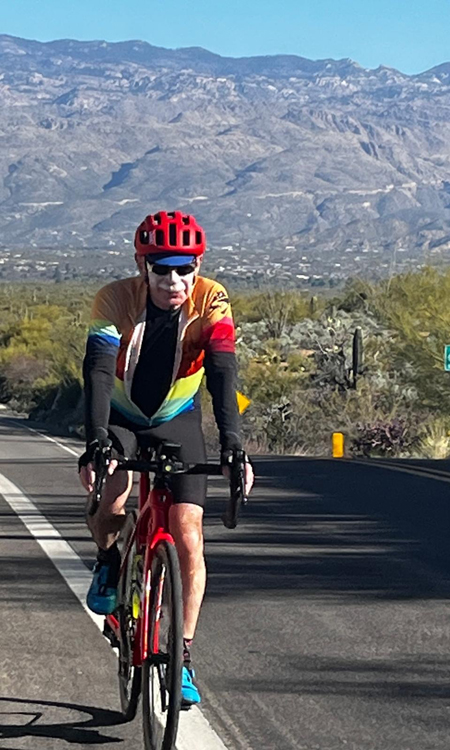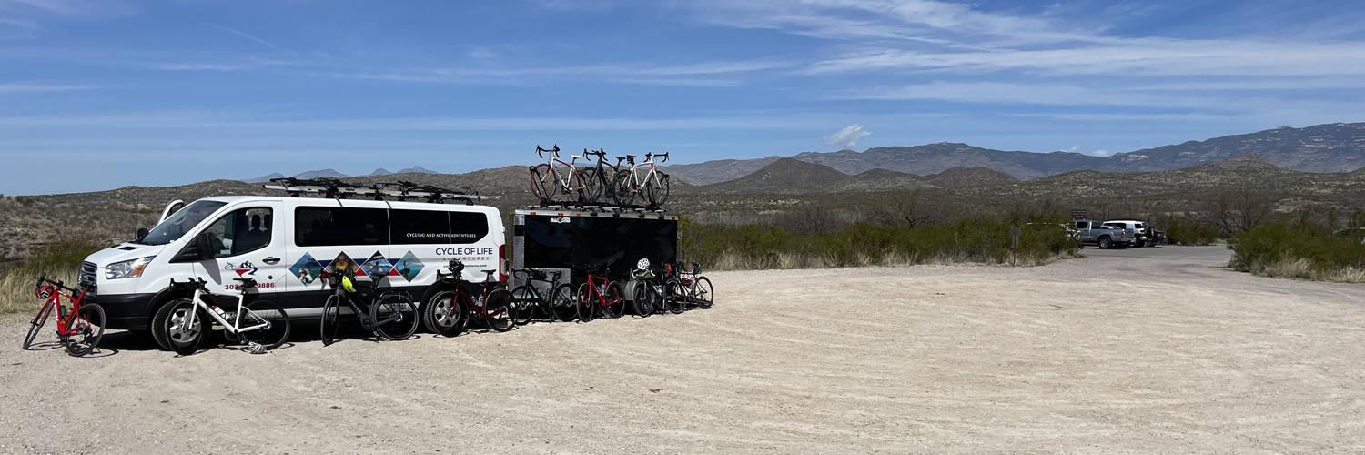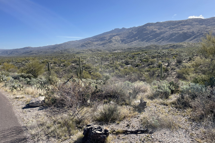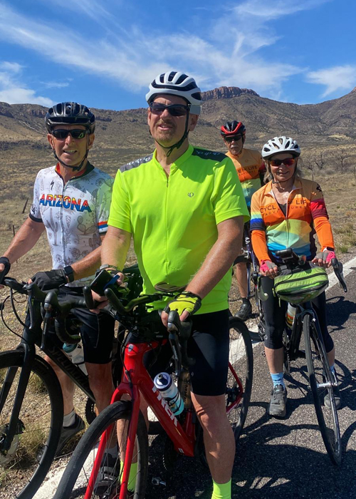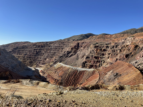 There followed three amazing days including a century ride, with the wind blasting from the west. We got a late start out of Bisbee because breakfast did not open until 8a. But by pre-ordering the night before (and Dennis and Bobby bussing/waitering again, everything was on the table by 8:10. On the outskirts of town, the road ran right passed the open pit mine giving us an awesome view (in both senses of the word)