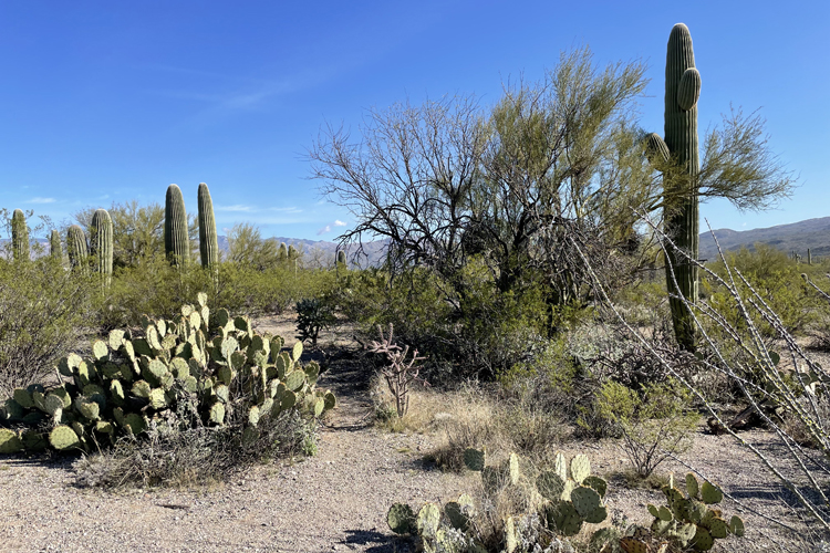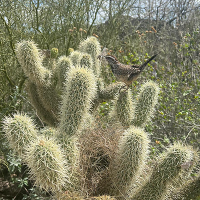 Our usual 8:00a start, and we'd only been on the road about 10 miles when we got to the Saguaro National Park, where we did the 8 mile road loop through the park. Despite leaving my National Park membership card at home—an unforgivable sin since I knew we were coming here—I was able to sweet-talk the Ranger into letting me in, based on the photo's CMT had sent, which means I and four others were in too. I think there were enough cards to do the whole crew, which was a great win for Dennis. Looks like a cactus. Looks like a wren. No surprise then that this is an excellent pic someone grabbed of a Cactus Wren. My guess is Billy-Bob.