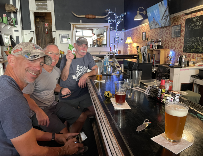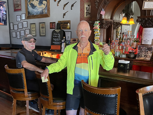 Texas: so first steaks of the trip! This new regime seems to have transformed Bill too. I for one was effusive when I came by him on the ride, letting him know how great I thought it was that we were both in front, and I'm sure others did the same. But he might also have realized the even the whiff of a feeling that he was part of a team felt better than he ever imagined. At the Great American Steakhouse—first night in Texas, gotta have steak—he was the life and soul of his end of the table. I was still struggling with him so was happy to be at the quiet end. Anyway, he still regains a point for his change of attitude today. I had fillet minion, mash, beans, coleslaw, and baked jalapenos. Good but not the best I'd ever had, though that could easily be more the result of trying to get a dozen plates to the table simultaneously than a general problem with their standards. The Sante Fe Happy Camper IPA was similarly unenthusiastic.