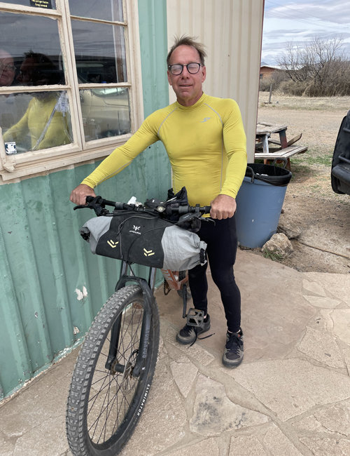 At a water stop at the Hachita Food Mart, we met Jeff Cullen a complete bike nut, who was preparing to do the Continental Divide off-road race. This piece of complete insanity is an ultra-endurance bikepacking race along the complete length of the 2,745 mile Great Divide Mountain Bike Route from Banff, Alberta, Canada and finishing at the US/Mexico border in Antelope Wells, New Mexico. The Great Divide Mountain Bike Route (GDMBR) itself is the most recognized and important off-pavement cycling route in the United States, if not the world. Might be fun but self-supported racing? But crazily, in this little town with a single-digit population count, Jeff was not the biking nut that Dennis had predicated would be there, and who would come out to chat with us. |