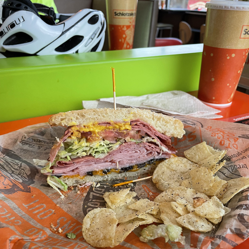 Schlotzsky's in East El Paso because too cold for picnic. Deluxe Original (twice the meat) ham, salami, 3 cheeses, olives, onion, lettuce, tomato, mustard, signature sauce, on sough dough.