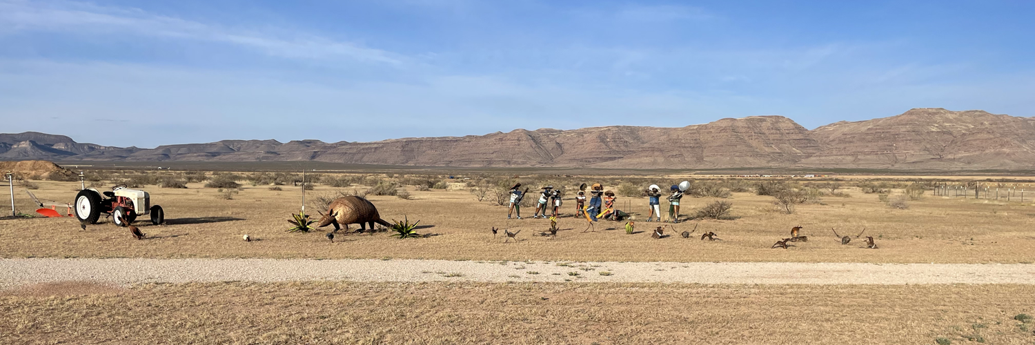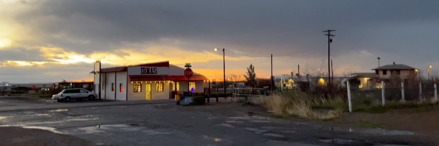 Today wiped the smirk off my beak, and everyone else's. Hail as we set off at first light added to the misery of the 15 to 20 mph head/crosswinds. Rest stops increased, as did the time spent in them, with most folks piling into the van with its heater set to Sauna until the order to get back on the road. After 52 miles and 6.5 hours we rolled into the Traveling Tiger Center - Texas 87 Truck Stop and Travel Center in Sierra Blanca, and at the junction with I-10. In addition to that mouthful, it was also a Mexican Restaurant. At that point we were only half way and now we were going to be directly into the wind and 10 miles of uphill. Dennis ordered us to order lunch in the restaurant so we could get something hot inside us and to warm up generally. The entrance was through an enormous, empty souvenir shop. A perfect spot for the opening scene of a teen horror flick.