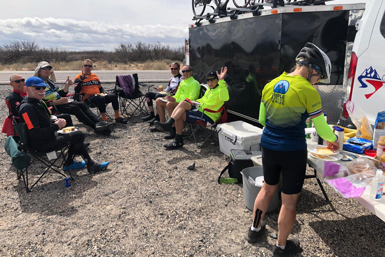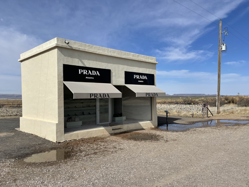 The weather was better in that it was not snowing, so it was actually quite nice for the first few miles in the sunshine. I even stopped a couple of times to take pictures. The first 45 miles was a dead straight, slight but relentless climb, and the wind took a couple of hours to pick up but then it was right into our faces. The "Prada" pit stop was surreal. In the middle of nowhere, a down-town cube of a building, with the roadside wall a glass store front and door, and in the window dozens of Prada shoes. It was a store that never opened, a work of art. No really. The whole thing was set up as a work of art. Several people stopped, took selfies, and drove on even in the few minutes I was there. I was warned that I was still a long way (too far) ahead of the pack, and I was held for a few minutes, but I needed to keep going.