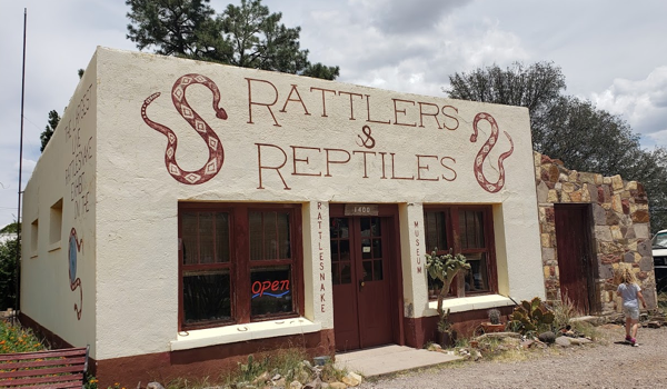 As we completed the circuit back in Fort Davis, we realized we still had time to take a swing at the Rattlesnake Shop if we could get someone to answer the door. The Rattlers And Reptiles Rattlesnake Museum was quirky from start to finish, head to toe. First up, for the "largest collection of live rattlers in the world" it is tiny. Then although this was within opening hours, we had to call the proprietor to come open up. At $7 a head for 15 or 20 minutes of viewing time (plenty, at least for us) it wasn't cheap.