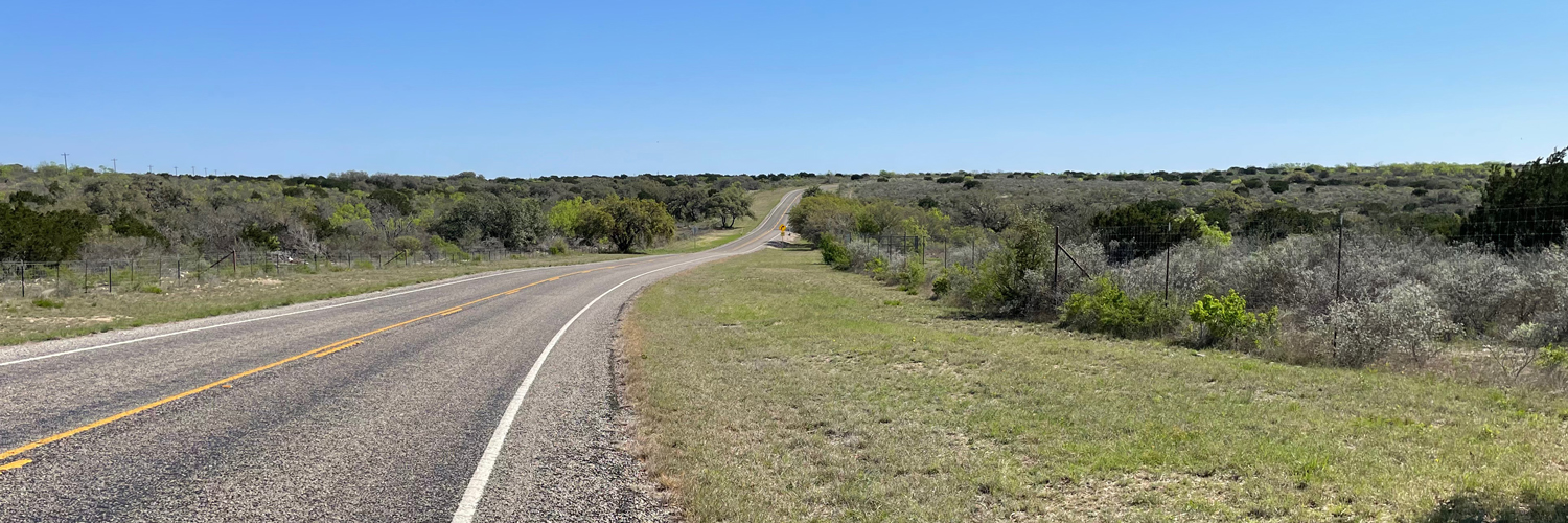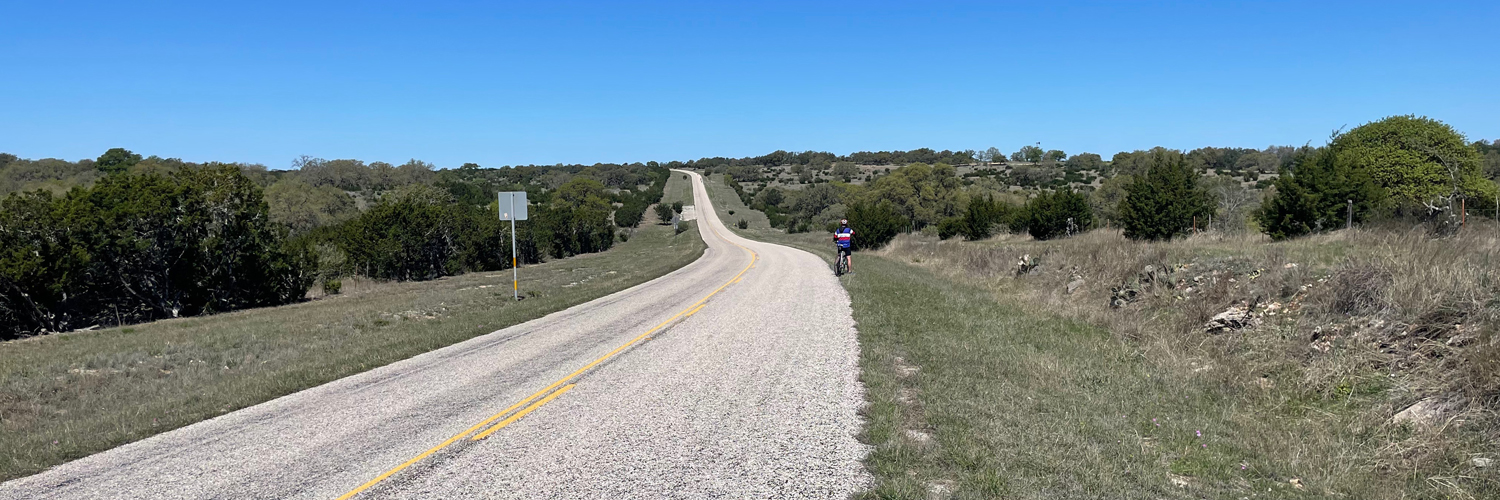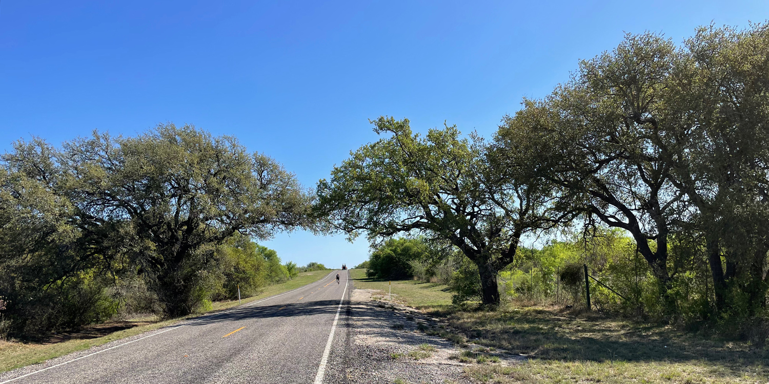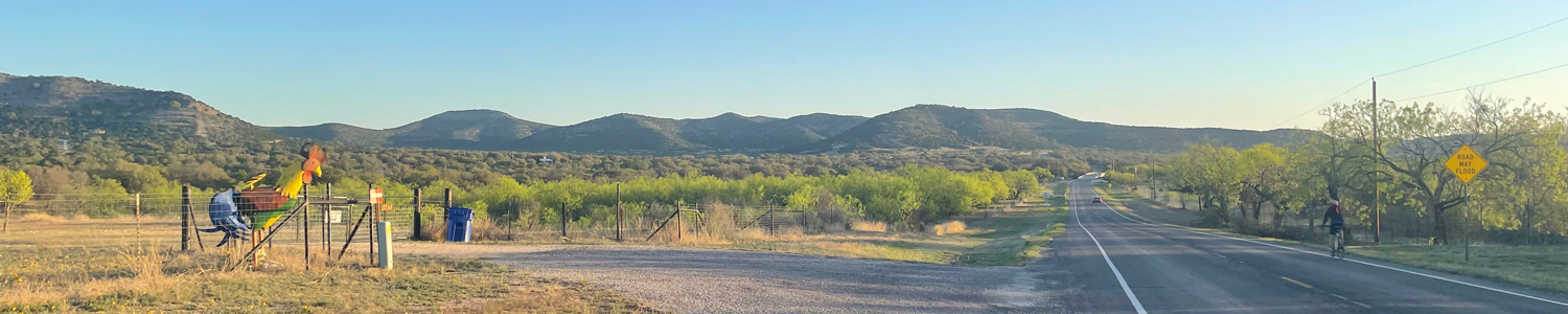 At about the 30 mile mark we turned onto much more rural MR674 and immediately lost the traffic. Just as immediately, Texas Hill Country was apparent. Trees, some of them big trees, not just on road- or creek-sides but sweeping back as far as the eye could see. Grass and flowers along the roadside. Ranch entrances much much closer together than we'd seen until now, reinforcing how much less land was needed to make a living. The rolling green hills and curving roads seemed a perfect setting for motorcycle riding. The only reason it was not ab-so-lutely perfect for bi-cycle riders is what we've now termed TWB Texas WashBoard which Betsy defined thus: "the horrid chip seal that coats the roads we’re traveling in South Texas. Chip seal is a thin film of heated asphalt liquid sprayed on the road surface, followed by the placement of small aggregate ('chips'), and is 20-25% cheaper than a regular asphalt road. It looks like packed down gravel but rides like a washboard, forcing bruxism with every wheel rotation."