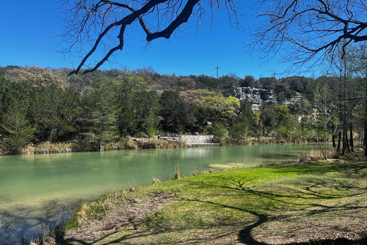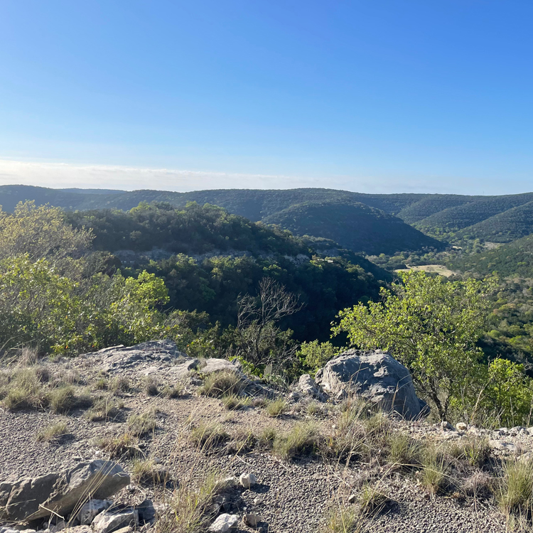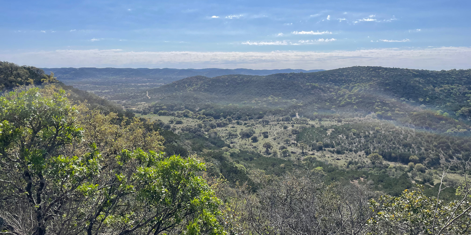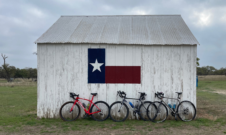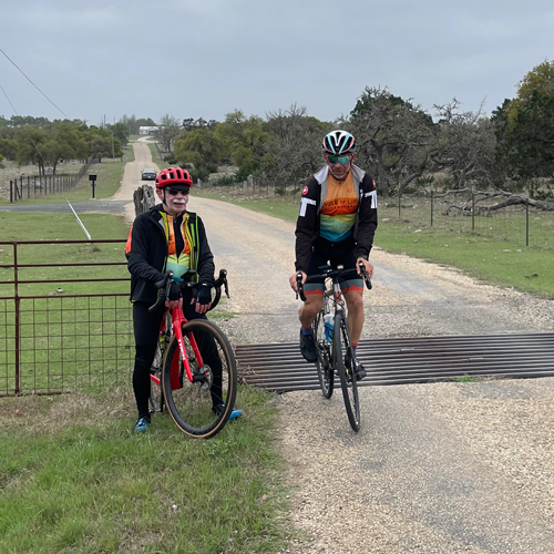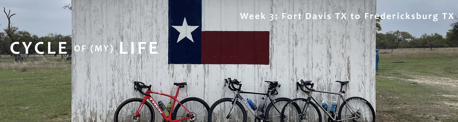 At about the 30 mile mark we turned onto much more rural MR674 and immediately lost the traffic. Just as immediately, Texas Hill Country was apparent. Trees, some of them big trees, not just on road- or creek-sides but sweeping back as far as the eye could see. Grass and flowers along the roadside. Ranch entrances much much closer together than we'd seen until now, reinforcing how much less land was needed to make a living. The rolling green hills and curving roads seemed a perfect setting for motorcycle riding. The only reason it was not ab-so-lutely perfect for bi-cycle riders is what we've now termed TWB Texas WashBoard which Betsy defined thus: "the horrid chip seal that coats the roads we’re traveling in South Texas. Chip seal is a thin film of heated asphalt liquid sprayed on the road surface, followed by the placement of small aggregate ('chips'), and is 20-25% cheaper than a regular asphalt road. It looks like packed down gravel but rides like a washboard, forcing bruxism with every wheel rotation."