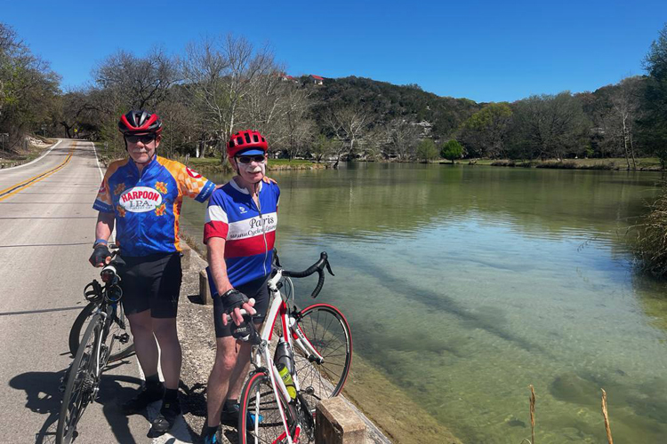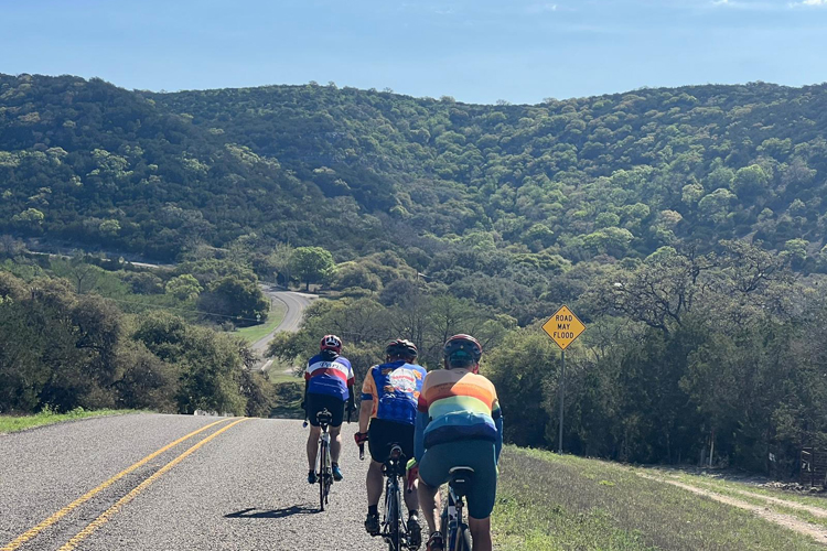 Texas Hill country today, at 5400ft the second greatest climbing after Day 1, and it was marvelous. Betsy described it as "endless folds of road that look like striped taffy, rising and falling as far as you can see in the distance, draping over the hills and limestone cliffs and cutting through groves of bright green trees." Exactly. And literally thousands of Harleys. 80 miles, four big climbs with serious anaerobic work for 1-2.5 miles to each peak, sweeping long downhills followed by the next grinding uphill.