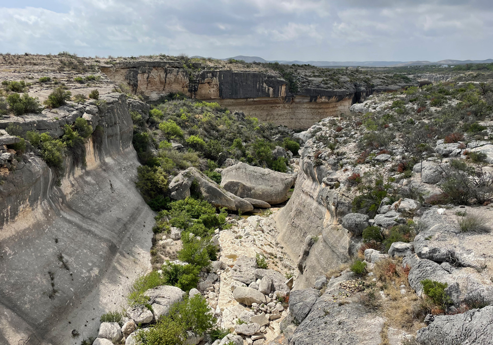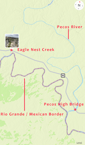 That canyon turned out to be Eagle Nest Creek. A stone's throw from the Rio Grande. It was only as I prepared photos for this blog that I became aware of the amazing geography that was unfolding around us. The photo of Eagle Nest Creek was taken almost literally a stone's throw from the Rio Grande, and I 80 is being funneled into the narrowing gap between the Rio Grande and the Pecos River, making the Pecos High Bridge our only exit.