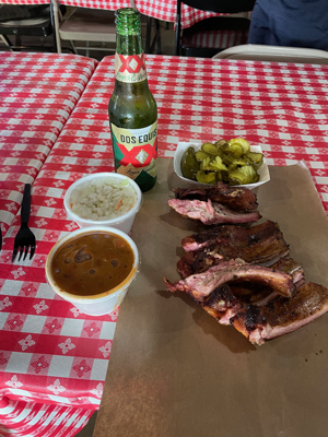 Rudy's Real Texas Bar-B-Q (and gas station) was as awesomely eccentric as it sounds. The three minute walk from the hotel was plenty in the heat and humidity. Inside it was a barn, with 40 ft long tables encouraging mass communal dining. On the way to the serving hatch at the back right corner, one of the tables was replaced by a shallow galvanized tank. Like frozen terracotta warriors, beer bottles were lined up rank and file and up to their necks in ice, so all you could see was the cap. So grab your beer, then pass by the cooler with sides such as cole slaw and ice cream then on to the cashier who took your meat choice (orderable in half-pound increments) and any hot side such as beans. Load everything onto your tray and find somewhere to sit. Not a problem at that time of night. Then I discovered that I'd missed an entire display of pickles and went back for pickled beets,jalapenos, and regular old pickles. Oh boy. Obviously I had baby-back ribs, but the brisket looked just as good.