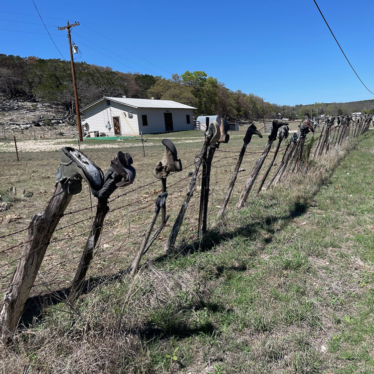 I swear I saw oryx through the trees at one point and then Dave saw something else equally exotic and incongruous. Finally we passed several grand stone entrances to the San Carlos Ranch giving me something to reference when I got home. So I did. "We offer the following facilities if you want a trip of pleasure, rest, relaxation or a hunting experience. We offer a wide variety of species of livestock for anyone’s hunting adventure. If you’re looking for a place to get away to rest and relax, San Carlos is the place." The mind boggles. You can rest and relax, or you can hunt the big game trapped by a fenced-in 10,000 acres. And yes, the game include oryx, water buffalo and bison. At about the 70 mile mark we came to the apparently famous "Boot fence" which I personally found fairly disturbing. Someone later pointed out that the fence is the unofficial "official" halfway mark between San Diego and St Augustine. I've just done the math, and if it is where I think it is, based on the aerial maps, we were 1525 miles in at this point so indeed, within only a handful of miles of half way. So I'll take it. A memorable half-way point. As to the meaning of the boots, there are a bunch of theories, but they mostly all boil down to respect. A tribute to a family member or hired hand who passes away, or a favorite horse that died or was sold, or even for the boots themselves now they have worn out. The last 10 miles were way more “domesticated” Two to five acre lots one after the other on both sides of the road. Although it was supposed to be "downhill all afternoon" and the fact that we weaved back and forth across the Guadalupe River implied the same, in fact every time we crossed the river there was a vicious little uphill to follow. Only a few hundred yards, but always bottom-gear-stand-on-the-pedals stuff that steadily grinds you down. As we finally hit town the river, or more accurately Lake New Ingram, fed by the river, was wide enough for waterskiers to come skimming by. The motel had a pool! Yay! It was f r e e z i n g! Yikes! No thanks. "Piffle" says Billy-Bob who tried to empty it with a bomb-dive. He manfully stayed in long enough to appear reasonably casual as he made his way back to the edge, then more sensibly retired to the beer cooler table. |