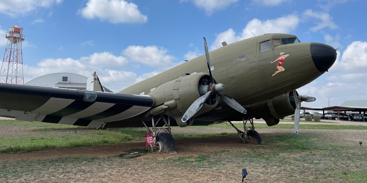 We met a much more chatty west-bound through-biker, who stopped of his own accord at a water break and swapped stories about the route, and how great the wind was being. Grr. The last memorable sight was at Gillespie County Airport on the outskirts of Fredricksburg where an old DC 3 was parked so close to the perimeter fence that we couldn't get it all into the shot.