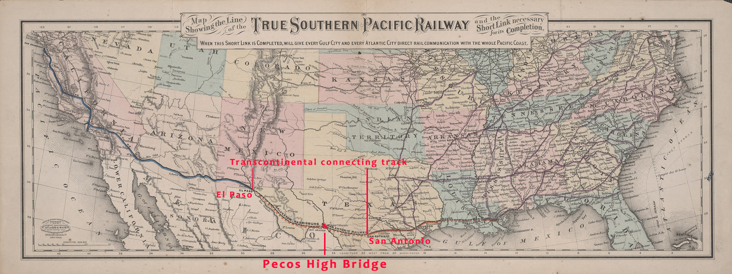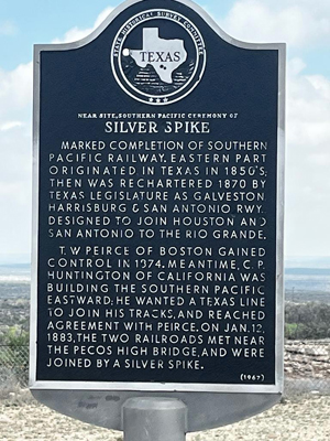 Okay, so I'm a railroad nerd. I'm crushed that I did not see it for myself, but close to the rest stop just east of the Peco High Bridge I missed the "Silver Spike" Historical marker. Fortunately I was once again saved by Bobby who knew I'd want to know. The Silver Spike marks the point at which the two ends of the Southern Transcontinental Railroad finally connected on Jan. 12, 1883. This was some 15 years after the Golden Spike (NP) at Promontory Summit, Utah Territory which marks the much more famous site where the Central Pacific Railroad from Sacramento and the Union Pacific Railroad from Omaha connected on May 10, 1869, at Promontory Summit, Utah Territory. Since I'd never heard of the Silver Spike, I sought out additional information from that font of truth and wisdom, the interweb. The first reference took me right to a page about the Historical Marker we had passed. The page does little more than describe the marker, which claims that "The Galveston, Harrisburg & San Antonio Rwy. was designed to join Houston and San Antonio to the Rio Grande." We had crossed the Rio Grande 400 miles west of here in El Paso. So why did it stop here on the Pecos? The second reference to a Silver Spike made things worse. It claimed that "In March 1881, a silver spike was driven into the railroad at Deming to mark completion of the second transcontinental railroad, which united the Santa Fe and Southern Pacific railroads." Deming is in Arizona and even further away from here. A third page, and a more thorough examination of the map resolved the mystery. This page also referred to the Deming site but like the Deming marker itself, made no reference to the completion of the second transcontinental railroad. Instead it celebrates the linking of the Southern Pacific railroad with the Atchison, Topeka and Santa Fe railroads. It was this new more extensive Southern Pacific, stretching to El Paso, that two years later was extended eastward to meet the Galveston, Harrisburg & San Antonio which was meanwhile being extended west. Galveston and Harrisburg would today be called Houston. Houston, San Antonio, and the Pecos High bridge are on a dead straight line east to west so that makes sense, and then zooming out on the map I finally figured out that the Pecos drains into the Rio Grande just a couple of miles down from the High Bridge. So this was the perfect spot to meet. |