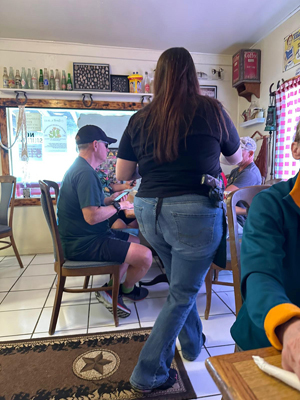 The Ranch House on the other side of town was a shack in both appearance and attitude. The waitress was packing, which seemed perfect. It was the sort of situation I love watching in movies, but are far too intimidating in real life except when you and your friends outnumber the folks in the bar about 5:1, and especially when chief Dennis has been here before and clearly wanted to bring us back. No surprise however that no one suggested we rearrange the furniture into our usual banquet style. Instead we all meekly sat down three or four to a table and waited to do what we were told. It was amusing watching most of us trying to sneak a snapshot of the (tiny) gun on her hip, and I'm so happy that Doug (I think) managed to grab the one I've borrowed here. Apparently our packing friend softened a little when I had the temerity to ask "What is Texas toast?" She was obviously incredulous that someone would not know the answer to that, and the actual answer was so obvious that it sorta made the point: "It's like regular toast but bigger". Of course. It was a door stop. Finally she recommended the cobbler dessert, of which there were several. I don't normally do dessert but I normally make an exception for cobbler, and I had the peach and banana, an unusual but delicious combination. Nobody complained about the lack of ice cream. |