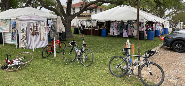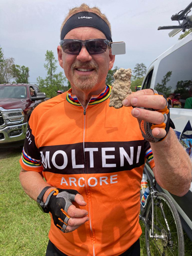 We stopped at Bastrop State Park for lunch, and a bunch of folks bought their cycling jerseys, then we headed further in to the picnic spot. By then Bill was missing. About halfway through lunch he finally rolled into view, already most of the way through one of two of the biggest doughnuts I've ever seen. They would have had to be stacked on a dinner plate.