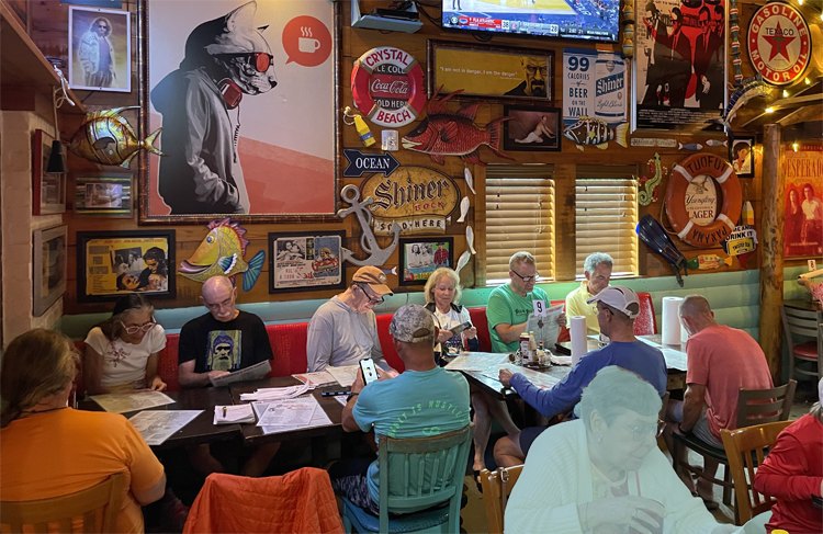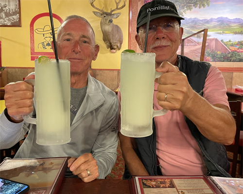 Somewhere in here I developed an Achilles problem. At lunch Dennis and Bobby helped me prop the ankle up in an ice pack and this kept me going for the afternoon. I developed a routine of filling my room's ice bucket as soon as I got home, making a large drink of ice water in my Rudy's Bar-B-Q 32oz plastic bucket then used the rest to ice my ankle. I finished the drink before heading to cocktail hour (a rule), putting the remaining ice in the refrigerator. This normally kept the ice cold enough for some to be left to ice the heel again in the morning, and always left enough to cool off my gin night cap if I felt like one.