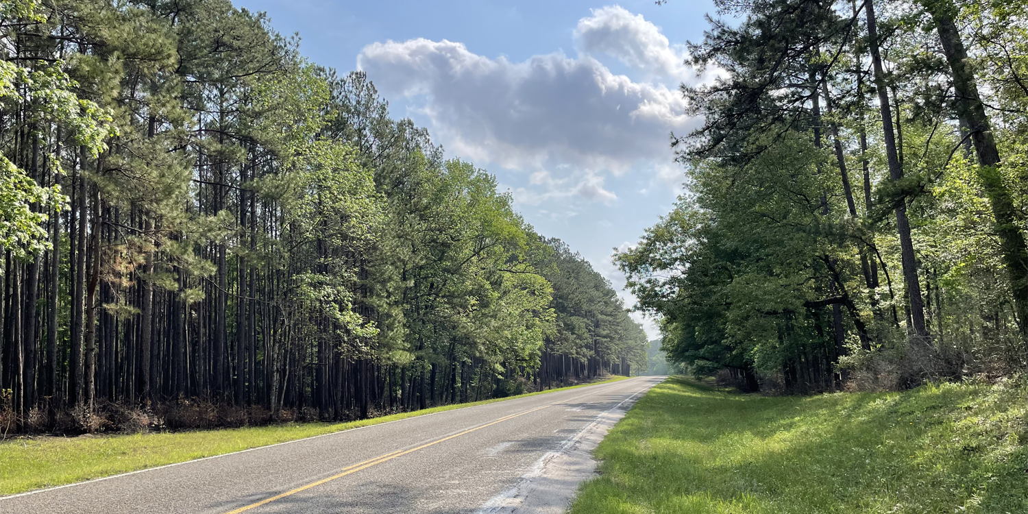 The Texas Hill country got less and less hilly every day, until they were truly rolling: so steaming down one side got you two-thirds of the way up the other before any gear change, and the new abundance of trees helped hugely to protect against the wind. We finally entered Sam Houston State Forest—trees!—a towering and endless corridor of fragrant pine, cedar, magnolia, and deciduous trees on either side of the road. We passed itty bitty fires in the State Forest that for the most part we could smell rather than see. The trees provided almost total protection from the usual cross-wind until we broke cover to cross Lake Conroe, the largest body of water we'd seen since the Pacific. Furious at the futility of its efforts for the previous several hours, the wind blasted across us, catching me so by surprise I nearly went down. Dave saw the correction and noted: "We are pretty good for a bunch of sweaty old geezers." |