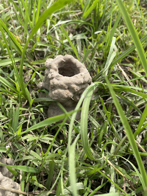 At one water stop we noticed these curious mud towers in the grass. They looked for all the world like worm castings except that they were huge—some were two or three inches tall. "Crawfish mounds" a local who'd stopped to chat assured us. Apparently they build mounds to protect themselves from predators and lay their eggs in them. Such holes can be 2-3 feet deep or more, depending on the water table. They dig down for safety, and to get to water by pushing mud and sand into place with its claws, then smoothing it out with its tail into what looks like a chimney. It turns out they are considered something of a pest: some of the other sites I looked up gave advice on how to get rid of them. Our chatty friend regaled us with tales of his travels, and provided me with a quote for the day when he described one location as having a population with "too many sticks in the mud." It seemed particularly appropriate next to our little field of crawfish mounds. |