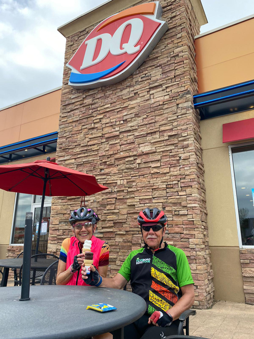 It may have only been Day 1, but we already knew about Shelley and her Dairy Queen habit. So when I spotted one about a mile from home, I suggested we got started the way we intended to go on. One slight flaw with the plan was that it was on the other side of a four lane not-divided highway. After a huge amount of time and a similar amount of good sense, Dave-the-Elder gave up on the chicken dash and headed home. But that's the story of how I got to try my first small dipped cone, hosted by Shelley the DQ queen herself, (Betsy recording the moment) and thereby accidently starting a daily tradition to hunt down a DQ in which to end the ride.