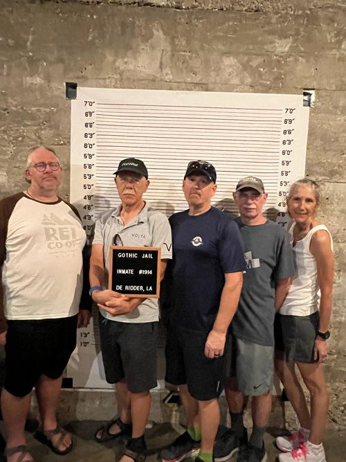 There was a rather complicated process for signing up for a tour of the jail involving chatting to the ladies in the Tourist Center (fortunately right across the street) signing several different registers and coughing up the princely sum of several dollars apiece. Honor satisfied, the ladies assured us that if we were on the steps of the jail at the appointed hour, we would be met by the afternoon guide. But that gave us over an hour to waste. Lunch. Cecil's Cajun Kitchen had been recommended several times, and we could see it from the Tourist Center. Sold. Except for Shelley who had set her heart on a Dairy Queen hit. Ungallantly nobody had stomach for the additional half a mile of walking, so off she went. Perhaps we should have joined her because my Fried crayfish po boy was interesting but absolutely no match for the pickle and oil drenched deliciousness that I'd experienced in New Orleans. Undeterred I couldn't resist trying a shot of the Pickle Vodka that was being advertized on the table. Ugh. It might have worked in, say, a Bloody Mary (which in its defence was probably how it was mean to be consumed) but it was so nasty I would not have wanted to risk spoiling the BM. Still I would have felt worse if I had not tried it. Shelley returned, looking very smug about her choice, and then it was time to head to jail.