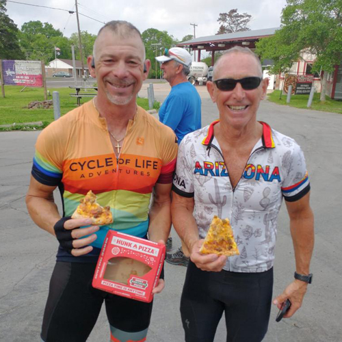 It was a long day, and Dennis made an executive decision to keep us on the main road for the last 10 miles into town instead of the planned (but much rougher and slightly longer) country road. About 9 miles on, when we stopped to take pictures of the town sign, Bill turned around to go the way he wanted, even though a group of us, including Bobby were right there, and riding into town together.