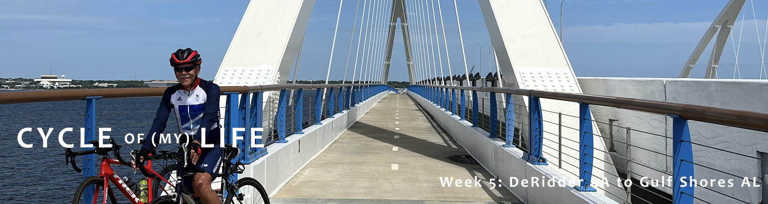 | Prologue | Wk 1: CA Hills to AZ Desert | Wk 2: High Desert to TX | Wk 3: TX Hill Country | Wk 4: Flowers and trees to LA | Wk 5: Mississippi to the Gulf | Wk 6: Florida Panhandle to the Ocean | Epilogue |