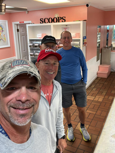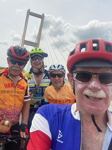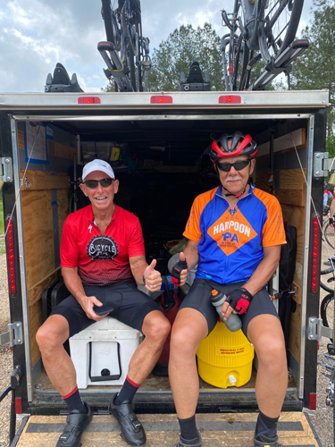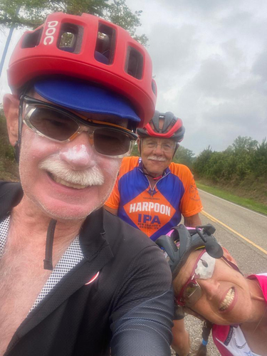 Today is another day. 88 miles this time, way more climbing, and way greater chance of rain. Once again a bunch of reasons not to be able to make it. But like I said, one day at a time. Dave-the-Elder, RT, Shelley: Surprise!