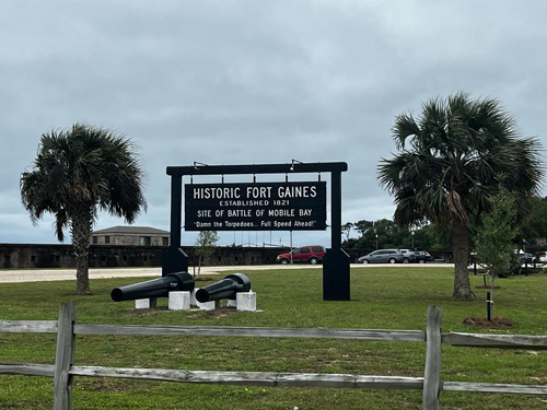 The intercoastal waterway and Dauphin Island Bridge were about as much fun as some of us could stand. Narrow trashed-out shoulder, too good a view of the cold gray cold water too far below, and of course a nice buffeting cross-wind. Even the photographers amongst us were reluctant to stop. The obviously beach-holiday resort community on the other side was a calming contrast though with its deserted streets the empty cottages looked as if they were as miserably cold as we were. Just a few minutes we were in line for the ferry. We aimed to be first in line which we were, and we therefore aimed to be in plenty of time, which we were. But there was absolutely nothing else to do around the terminal, so some of us got back on our bikes and wandered down the street where we found Fort Gaines. We did not have time to take a tour which would have gotten us inside, but we had a good look around the outside where we discovered that the Brits had held the Fort in the early part of the 19th century—25 years after Independence. That made no sense, so the Fort immediately went on to the "further investigation required" list. |
