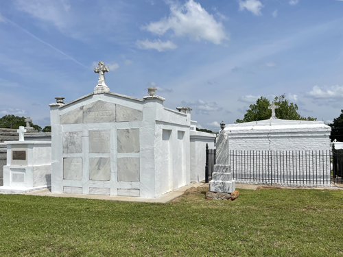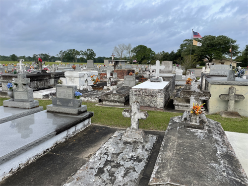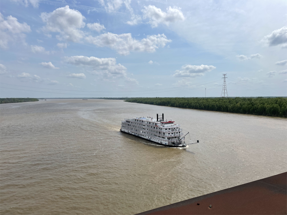 The rest of us pressed on and soon were confronted by a wide body of water: clearly the Mississippi. Or so we thought. I found a place with a good view and pulled over to take a snapshot of this momentous occasion. I'm so glad I picked it. Right there was an information board describing the appropriately named False River, an oxbow lake that of course before being cut off would have been a section of the Mississippi which currently was following a course that was still about five miles away. As we close in on the Mississippi the water table is rising and as a consequence so are the vaults in the cemeteries. The whole route seems well-manicured now, with immaculate lawns as weed-free and closely cropped as a golf green and even the road verges are neat and tidy. At about the 70 mile mark and soon after rejoining the victorious extra-pointers we finally reached the bridge. As we set off from a photo op right on the apex of the bridge Dave-the-Elder got a flat. Shelley and Kevin had already set off and there was no turning back, and the sag wagon couldn't do more than wave helplessly as it went by, so Dave and I were on our own until Stephen showed up. It took all three of us: Dave had most of the tools and the new tube; I had the muscle to wrestle the tire back on; and after a CO2 failure Stephen magically produced an old-fashioned brass hand pump which made short work of putting some pressure into the tube. I even had the time to wait for the steamboat to get close enough for a decent shot. |