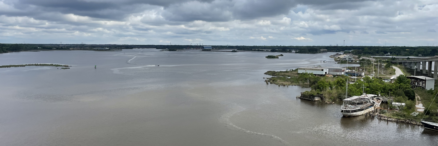 The Intercoastal Waterway and Bridge to Dauphin Island. At far right it looks like a bunch of victims making their final approach