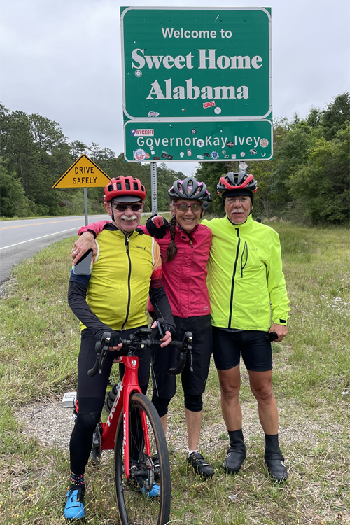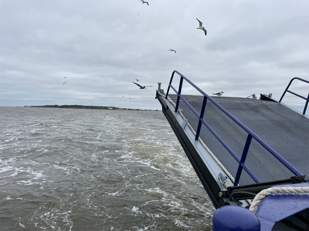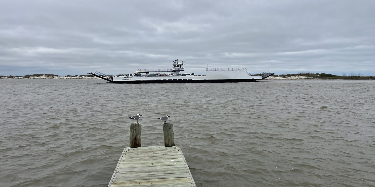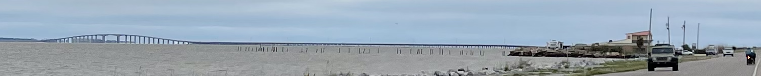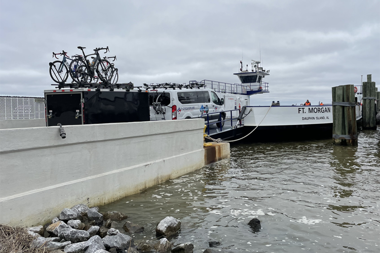 A very eventful day. As usual now, we woke to a stiff headwind, but this time it had a much more serious consequence: it could cancel the ferry across Mobile Bay. Almost as bad, it could allow the riders to brace the waves on the open deck, but not allow the high-sided van and trailer to travel. Both of these options would leave Dennis with the 100-200mile trip all the way around the bay, maybe with all of us inside, maybe not. We would not know the answer until we were well into the ride, depriving us of the pleasure of looking forward to it.