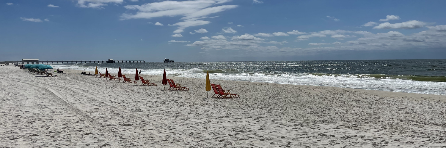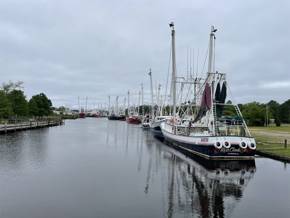 Just down the road from the ferry station we stopped to enjoy gumbo, po boy sandwiches, hush puppies, and more at Tacky Jack’s, a waterfront restaurant at Orange Beach. It was like an English summer beach day from my youth: way too cold for there to be any crowds, or for us to want to be out on any of the decks admiring the view, instead we were huddled up for warmth inside. I had gumbo, not wanting to spoil my appetite and / or eat too much with peddling still to do.
