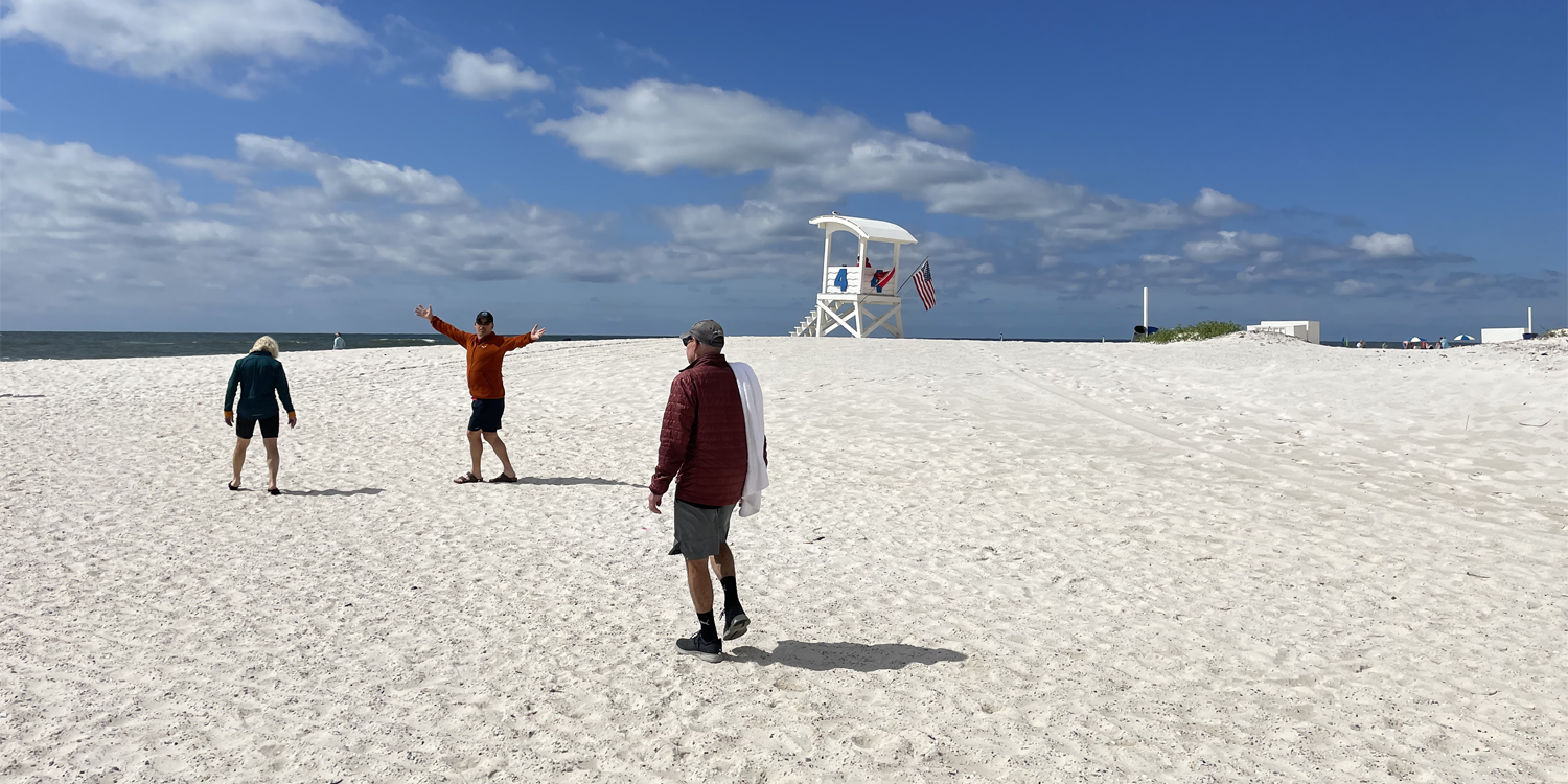 Next up the walk on the beach. Gulf Shores has some of the whitest beaches in the world, and they were right behind the hotels on the otherside of the street. In a move more befitting of Billy-Bob, Dave-the-Elder was determined to take a plunge, and a bunch of us rallied around to provide a support crew.