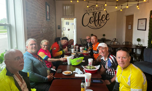 As we turned left onto the road into town, I somehow found myself at the front, and not wanting to be seen to give up, set a pace into the headwind that the big dogs were happy to sit behind. As we entered town about ten miles later, I found an excuse to stop: a water tower to add to Dave's collection. By pure serendipity, it turned out to also be the start of the optional bike path into town, which the B Team was delighted to take, and would not have been an option had we just kept going in the peloton.