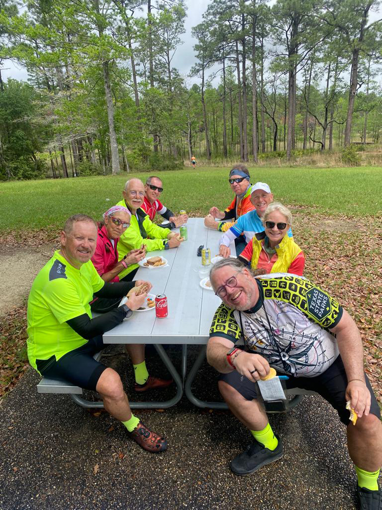 Sandhill Crane lunch stop: D-t-Y; Betsy; RT; Kevin; Steven; Doug; Betsy; Billy-Bob. One of my favorite group shots at one of my favorite lunch stops. Not sure what Bobby is doing in the background, and we will not ask.