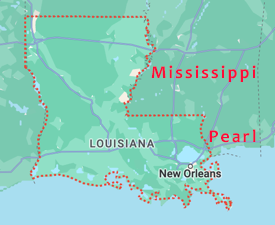 At the 27 mile mark we crossed the next big river, the Pearl, separating Louisiana from Mississippi. Yes, that was a surprise to me too. In the north of the state Louisiana and Mississippi are separated more appropriately by the Mississippi. But then about half way south the Gulf, the border suddenly heads due east about 150 miles until it hits the Pearl, and uses that to make its way to the Gulf just east of New Orleans. (The Mississippi hits New Orleans from the west.)